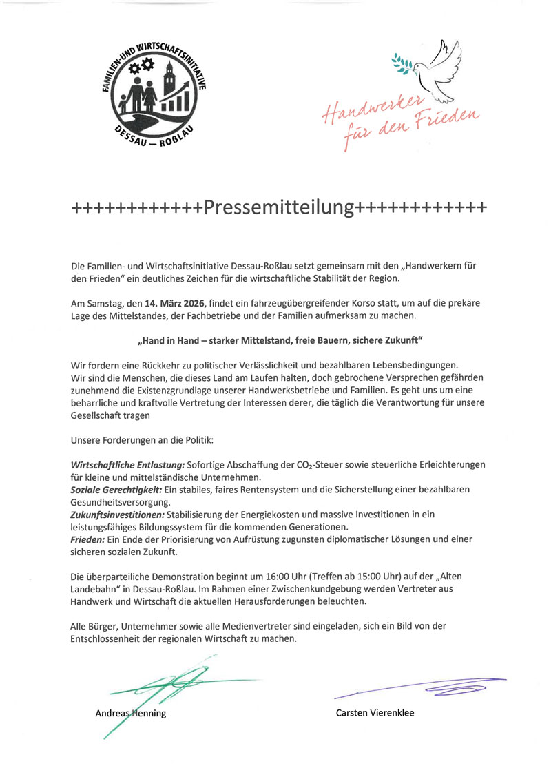 Im Sommer vergangenen Jahres entstand daraus die Initiative „Handwerker für den Frieden“. Die erste Kundgebung in Dessau hatte bereits 2000 Teilnehmer.